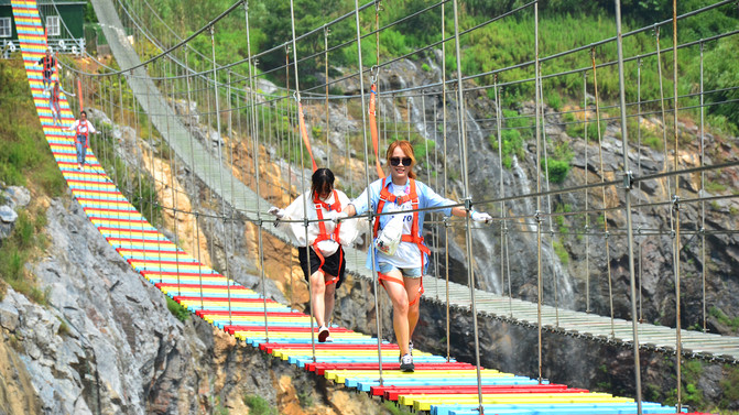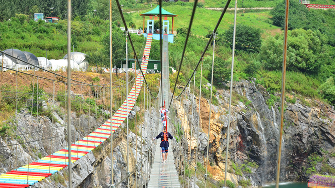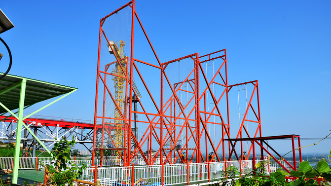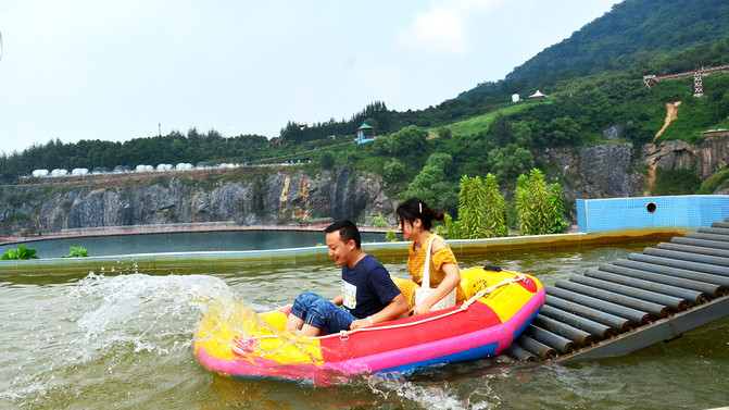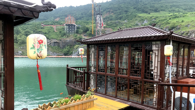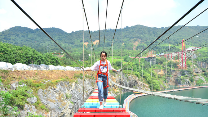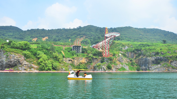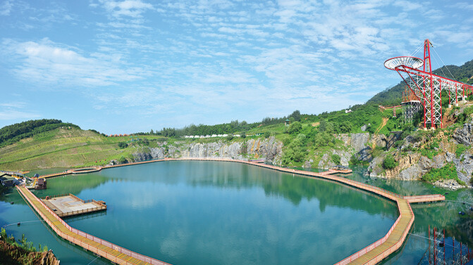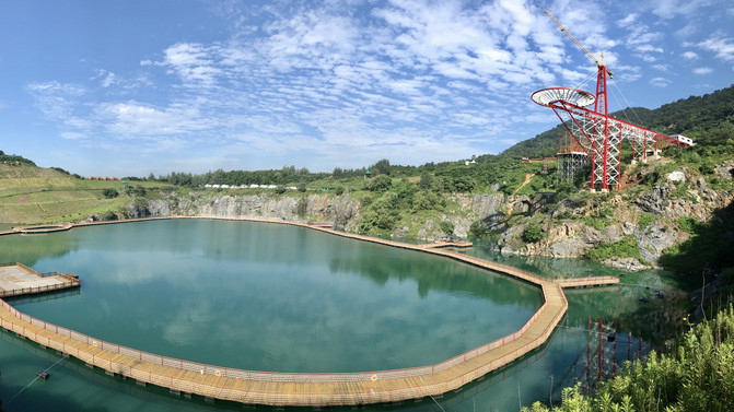 景区的大体环境是背靠大山(长山),面向丹徒大学城,属于长山的南坡,景区有一巨大的矿坑堰塞湖,湖面如碧绿的镜子,湖面上有浮桥,周边网红项目居多,如天空云镜、天空步道、悬崖秋千、漂流等,下面一一体验。