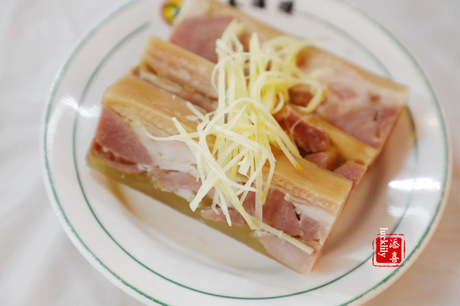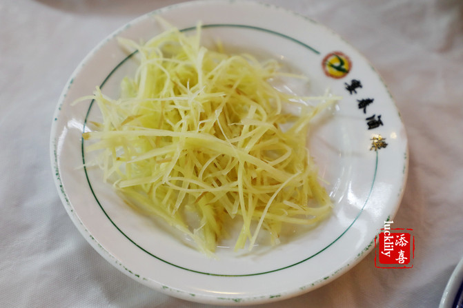 水晶肴肉18元一份,姜丝也是分开点的,刀切姜丝3元一份,夹了一筷子放到了肴肉上。肴肉吃了就会喜欢上,所谓肴肉不当菜,倒真是一道非常开胃的小食,可以当点心吃,胶冻的味道清凉冰爽,大爱。
