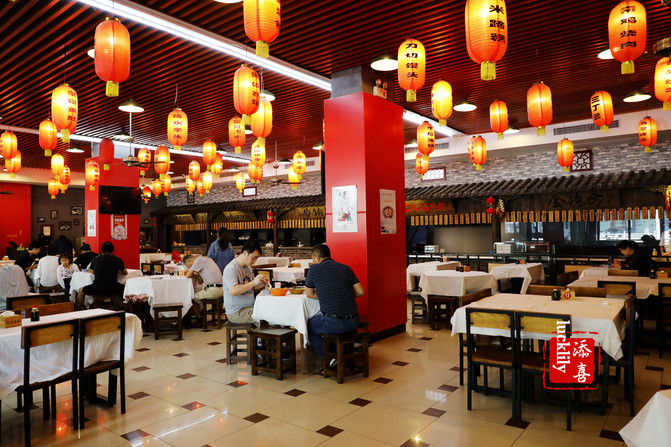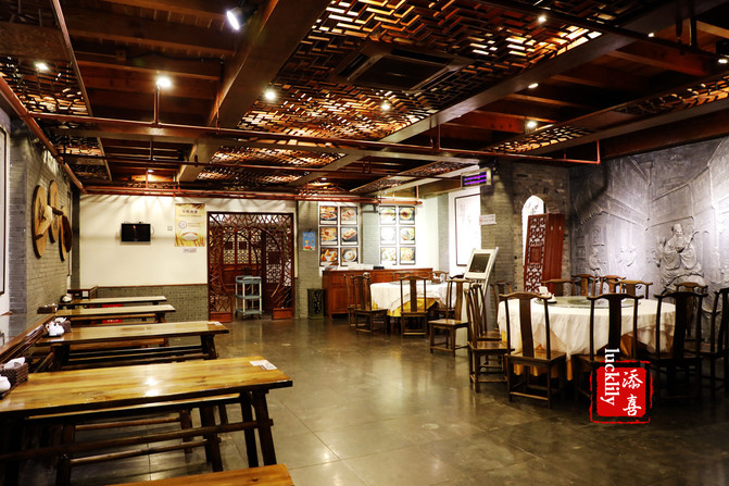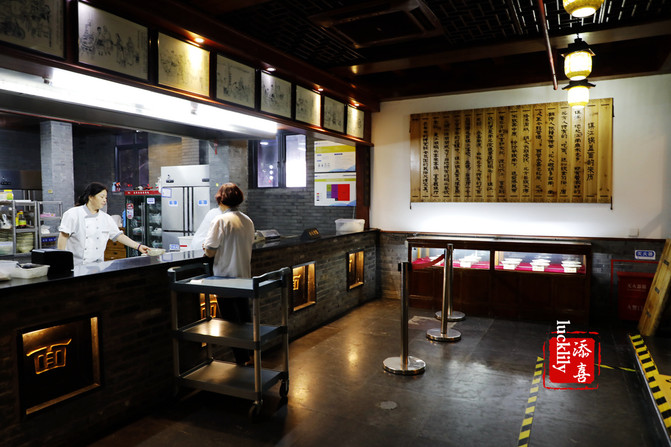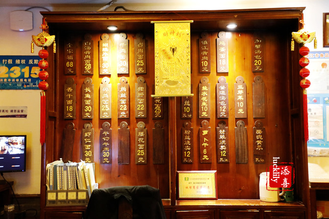 店面可宽敞了,分为好几个就餐区域,装修风格古色古香,壁上有锅盖面五字秘笈:“调”,“跳”,“漂”,“熬”,“浇”,分别应对调面,跳面,煮面,熬汤制作浇头等几个主要环节,看来锅盖面的选料和煮法都是至为关键的。