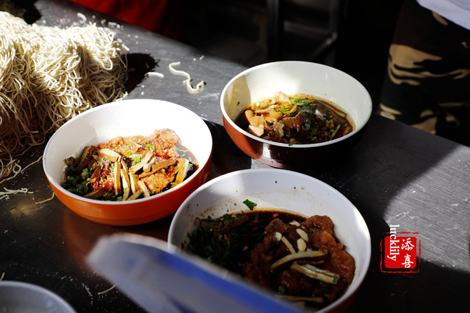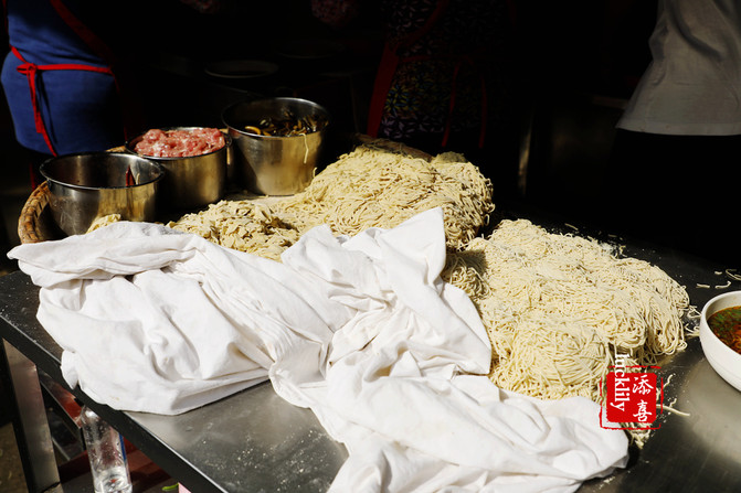 然后就端着那碗浇头去选择自己喜欢的面,有宽面、细面、扁面、圆面好几种。可以选双料,多料,就是几种浇头加在一起的。