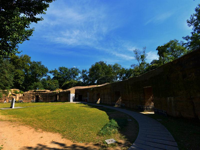 由宝墨轩东行,我们来到焦山东麓,看见在焦山脚下,石块嶙峋,有八个用石灰土夯实的炮堡,呈扇形,面对着长江的入海口,这就是著名的焦山古炮台。炮台为椭圆形暗堡式,每座最长处为 77米,最宽处为55米,每个炮堡都附有一座小弹药库,另有一大弹药库在炮堡南端门外偏西处。炮台以优质条石为基,用黄土、石灰、细砂配糯米法捣拌成三合土,分层夯实浇灌面成,坚固异常,内设6000—8000斤重的大炮,是目前保存较完整的近代炮堡遗址之一。