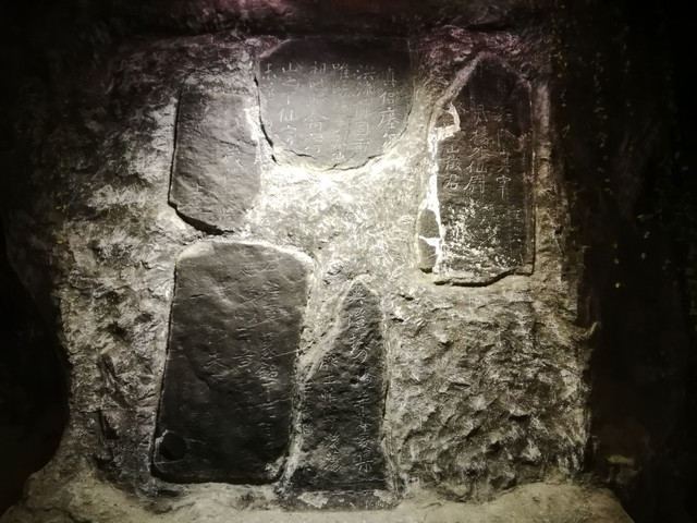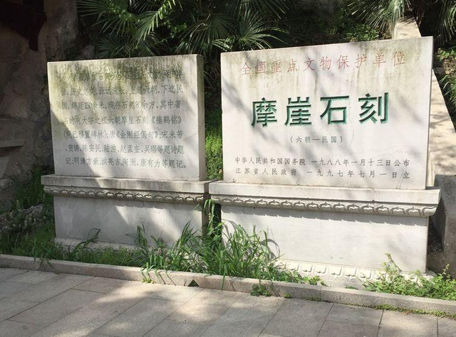 我们离开壮观亭,继续向南下山,看到这陡崖峭壁之上,遍布历代200多位名家的诗词题刻,这就是著名的焦山摩崖石刻。这些石刻的年代包括六朝、唐、宋、元、明、清乃至近代,字体有正、草、隶、篆等,内容丰富多彩,犹如古代书法天然展览,琳琅满目,美不胜收,为此焦山还有“书法之山”的美誉。一到浮玉岩,便看到宋书法家赵孟奎所写的“浮玉”两个苍劲秀丽的大字。在它的左面是陆游与游人踏雪寻访《瘗鹤铭》留下的题名石刻,最为引人注目。全文为:“陆务观、何德器、张玉仲、韩无咎,隆兴甲申闰月二十九日,踏雪观《瘗鹤铭》,置酒上方,烽火未息,望风樯战舰在烟霭间,慨然尽醉。薄晚,泛舟自甘露寺以归。明年二月壬午,圜禅师刻之石,务观书。”词文壮丽,书法刚劲有力。在另一块石上是北宋书法家米芾观看《瘗鹤铭》留下的题名石刻:“仲宣、法艺、米芾、元佑辛未孟夏观山椎书。”西北临江有一块近代石刻,以刚毅的笔力,镌刻五言诗一首:“为废不平均,呼号满神州,来此暂偃息,行作世界游。”这是中国律师协会在1920年为废除帝国主义列强的不平等条约,大声疾呼,到处奔走时,路过焦山留下的题名石刻。