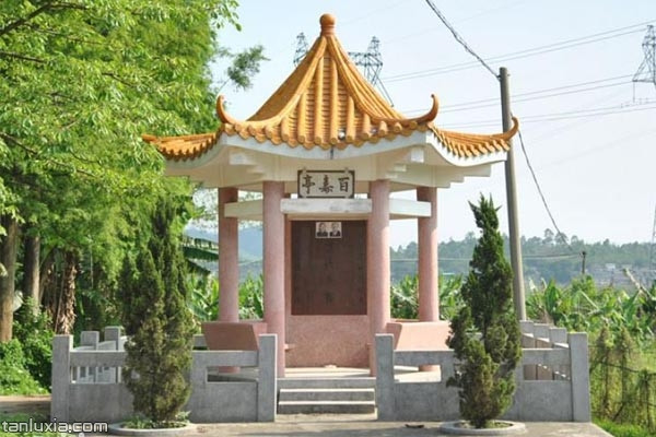 从别峰庵出来,向西走,路旁有一座用砖砌成的方形凉亭,周围有墙,墙头与亭檐之间用瓦镶成一排古寿字图案,东、西、北三面墙有拱门,东西两门山路贯串其中。南墙内壁中间竖嵌着四块条石,上刻一百个不同样的篆体寿宁,变化巧妙,别具匠心。上有横额“百寿亭”三个大字,北面门头上刻有“水云深处”四字。亭内有石凳,可供游人小憩。相传此亭的来历是:清末有一善士范某,看到焦山脚下别峰庵的山路非常崎岖,登临困难,便捐钱铺设一条花冈石山路,直达别峰庵,庵主为了感恩,就建了这座百寿亭为他祝福。