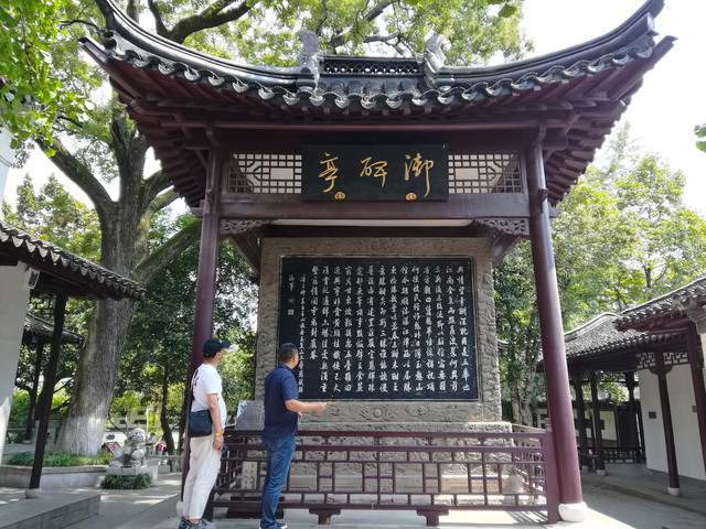 我们走进山门,穿过天王殿,院中有一座木结构的方形“御碑亭”,上盖琉璃瓦,亭中竖立一块石碑,上面碑文是乾隆皇帝第一次南巡时作的《游焦山歌》,背面是乾隆第三次来焦山时作的《游焦山作歌叠旧作韵》。因是皇帝手书刻碑建亭,所以称“御碑亭”。诗中乾隆将金山、焦山两处风景加以比较:“金山似谢安,丝管春风醉华屋;焦山似羲之,偃卧东床袒其腹。此难为弟彼难兄,元方季方各腾声;若以本色论山水,我意在此不在彼。”乾隆认为就山水本色来说,焦山更胜金山一筹。