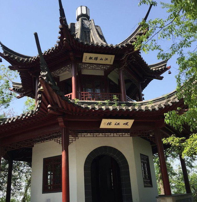 从古炮台北面上山,我们登上了焦山东峰绝顶,来到了“吸江楼”,原名“吸江亭”,因亭内四面有木雕佛像,人们又称它为“四面佛亭”。初创于宋代,明代弘治年间移建西峰顶上。清乾隆二十六年(1761年)复建于原址,四面塑佛像。同治十年(187年)常镇通海道沈秉成改建成二层八角形,沈秉成写了《吸江楼记》:“我在镇江游览期间,常想携酒游览焦山,因事务繁忙,未能如愿,今春稍有空暇,就邀约几个同事来到焦山,披开荆棘,攀登辘岩,盘旋而上,走走歇歇,终于到达山顶的四面佛亭。只因四周被树木遮掩,亭虽在山巅,但不能远眺四周景色,同时亭子已倾斜欲倒,因此,捐款将亭翻盖,并改建为楼。登楼俯瞰大江,只见苍茫万顷,眼界顿时开阔。此楼仍命名“吸江”,因不忘旧名也。”吸江楼与金山“吞海楼”相呼应,取“吸取江水煮新茗,买尽青山作画屏”诗意,更名“吸江楼”,现楼为后来重建,整个结构为水泥仿木。吸江楼一层横额题有“吸江楼”三字,二层楼上的“江山胜概”横匾系沈秉成嫡孙、当代著名书法家沈迈士于90高龄时所书。沿着楼梯盘旋而上,楼上回廊四通,四面开窗,八面有景,我们登楼临窗远眺,江水浩瀚,大江南北满旋风光尽收眼底,江北碧野辽阔,纤陌纵横,一望无际,江南苍翠青山,连丘叠嶂。此外视野广阔,气象万千,令人精神顿爽。这里视野广阔,历来为观赏日出的好地方,若夏日清晨登楼观日出,别有风味,历来为游人所称道。宋代诗人陆游,登此楼观看日出后曾赞之为“水天皆赤,真伟观也”。