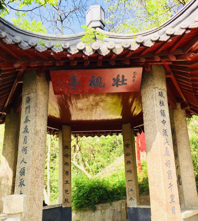 我们由三诏洞西行,沿石级而上,半山腰有一座六角亭,是明代天顺治年间所建的“壮观亭”,又名“坚柏亭”,亭名取自李白"登高壮观天地间"的诗意,登亭远眺,只见白水青山,江山景色荟萃于此,自然壮观美丽。亭柱上刻有三副楹联。其一云:“江天共一览,心迹喜双清”;其二云:“砥柱镇中流,此处好穷千里目;海门吞夜月,何人领取大江秋”;其三云:“金山共此一江水,王母来寻五色龙”,将焦山的景色气势,描绘得淋漓尽致。赵朴初登亭观景,写下了“壮观二字应无负,第一江山第一楼”的诗句。亭旁有千年古柏一株,号称六朝柏,挺拔潇洒,如娇龙昂首,顶天立地,至今千余年,还枝叶茂盛,苍翠葱郁,自成一景。宋一诗人曾为此题咏一首:“一株夭矫六朝松,多是坂埋与石封。不要点睛亦飞去,前生原是在天龙。”