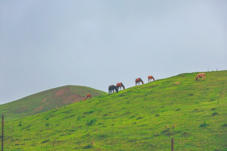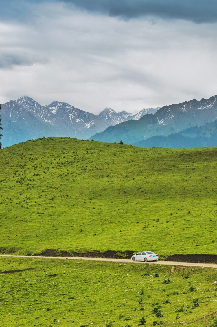 车子开到在两个景区的中间高地,明显感觉到气温骤降,风也大了起来,不一会就开始掉起了雨点。从这里可以环视两大景区,视野极佳,俯瞰远处蜿蜒的盘山公路,车子已经变得像玩具一样,山鹰在空中盘旋,骏马在山顶驰骋,这就是我心目中的新疆广阔天地啊。