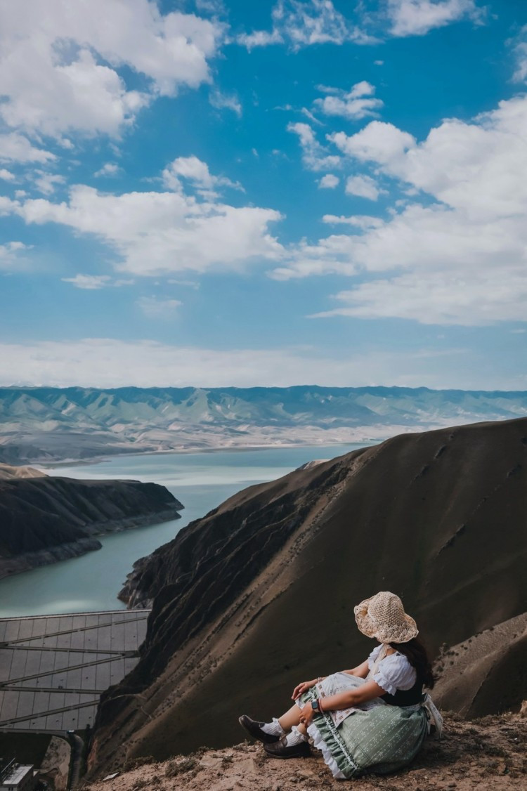 公路旁在水库大坝和克孜勒塔勒村之间有一处高地适合拍照,左手遥望炊烟渺渺的小村庄,右手是被大坝拦住水平如镜的湖泊。