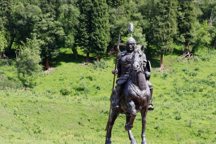 山脚下一座古代骑士雕像颇为惹眼,这就是哈萨克民族英雄喀巴班依,百年前率部抗击外敌,英勇威猛,成为后人楷模,远处最高的雪峰就以他的名字命名为喀巴班依。