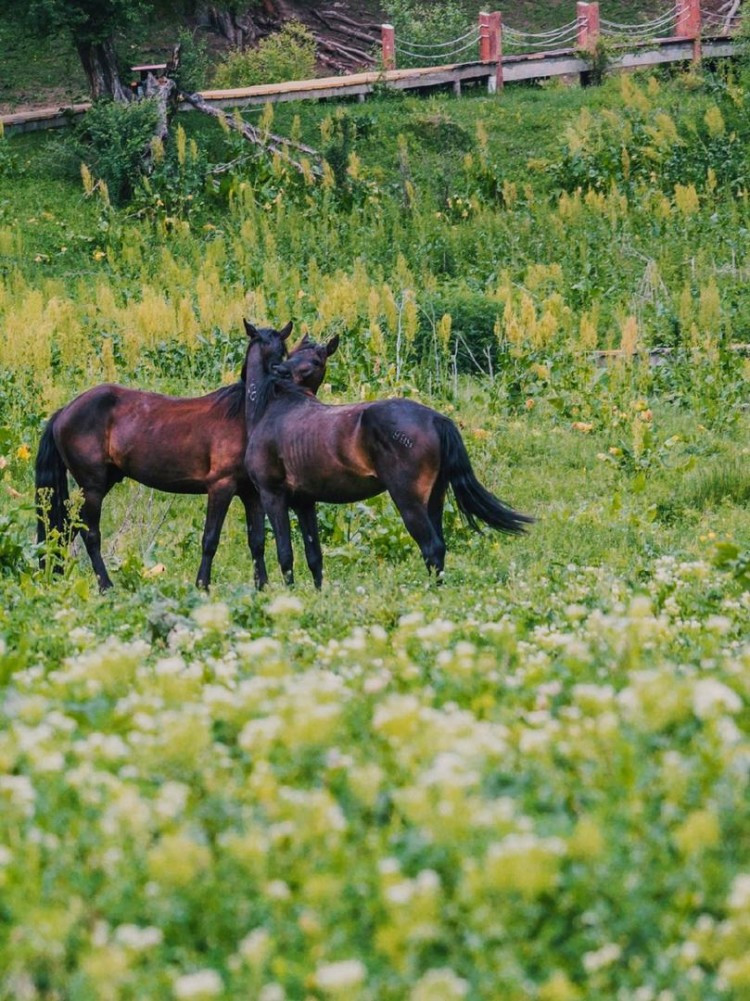 山路崎岖,有时车子还会涉水而行,路上出了个小插曲,我们一辆车突然爆胎,等候换胎时我们其他车开到了山路的尽头,意外遇到了哈萨克人的马场,几十匹体型俊逸的纯种马,几间宛如霍比特小屋的木头房子,又让大家兴奋了好久。