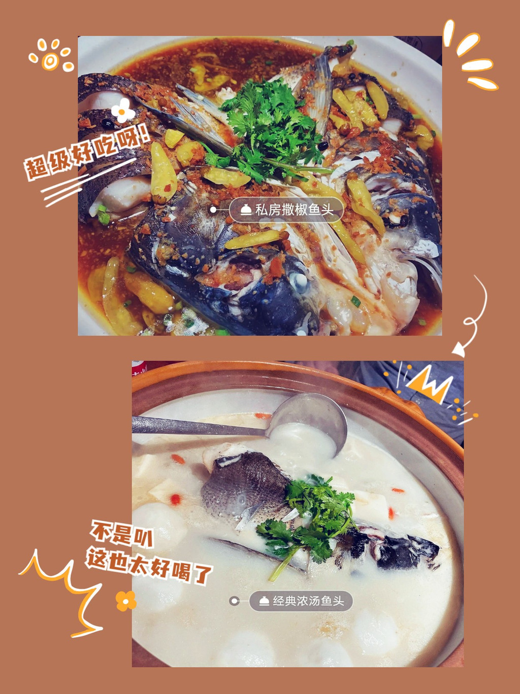 好东家:当地非常火的一家店,据说周笔畅、涂磊、吴磊都打卡过的!招牌菜私房撒椒鱼头和经典浓汤鱼头味道真的一绝,鱼肉超级鲜嫩滑爽,汤汁也很浓郁。人均90左右,性价比也很高哟~