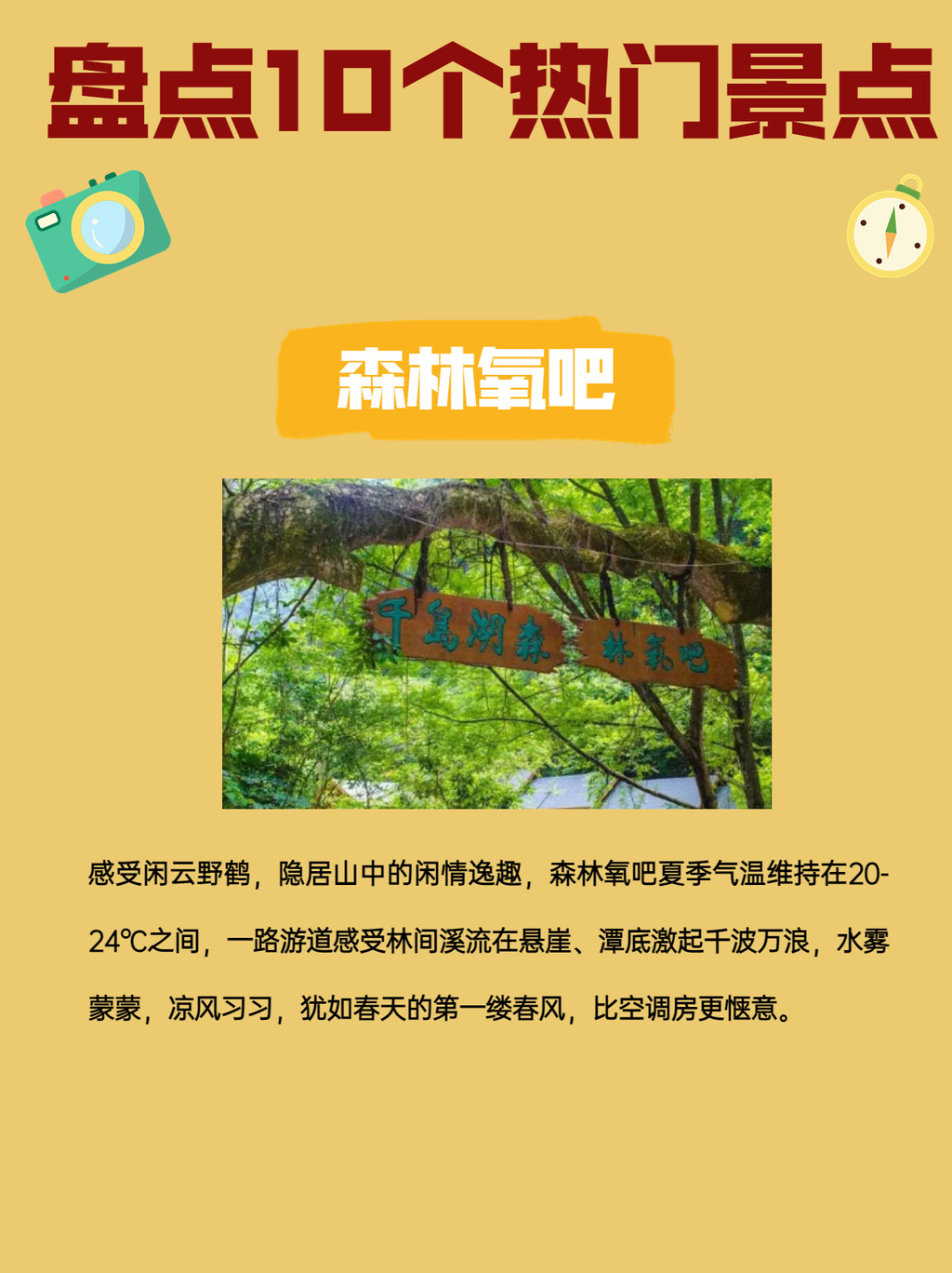感受闲云野鹤,隐居山中的闲情逸趣,森林氧吧夏季气温维持在20-24℃之间,一路游道感受林间溪流在悬崖、潭底激起千波万浪,水雾蒙蒙,凉风习习,犹如春天的第一缕春风,比空调房更惬意。