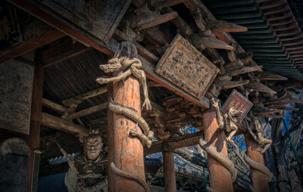三绝之二就是木雕盘龙了,同样是宋代工艺,雕于宋元佑二年,这是目前中国现存最早的盘龙雕柱,虽历经千年时光,但是八条天龙依然栩栩如生,气势逼人。