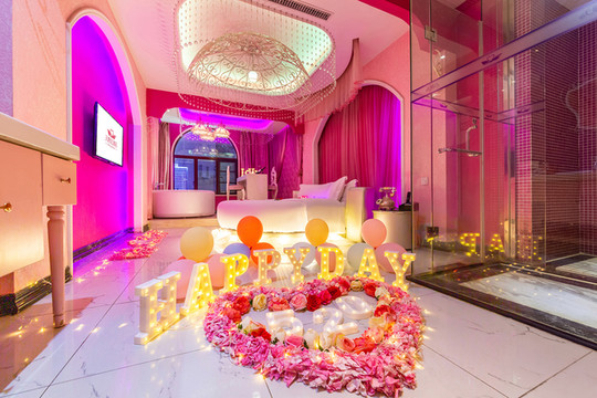 接着就去我们试睡的房间啦,我们选的是最经典的情侣主题,整体是粉红色,一进门就是满地的玫瑰花瓣,中间有超大的玫瑰花,房间整体给人的感觉就是超级小公主!水晶灯闪闪亮,羽毛飘飘,房间的镜子也反光折射,整个房间真的超好看!要是男朋友在这里求婚,我是会立马答应的!