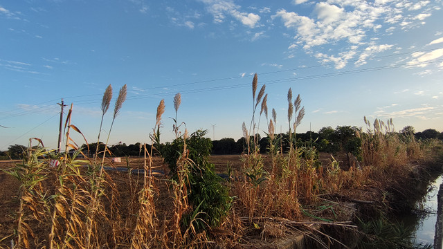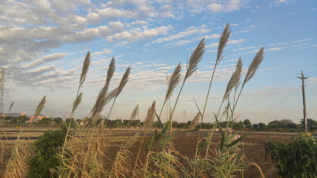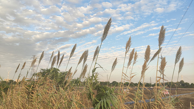 斜阳下,田间的芦苇随风飘荡。