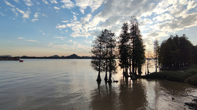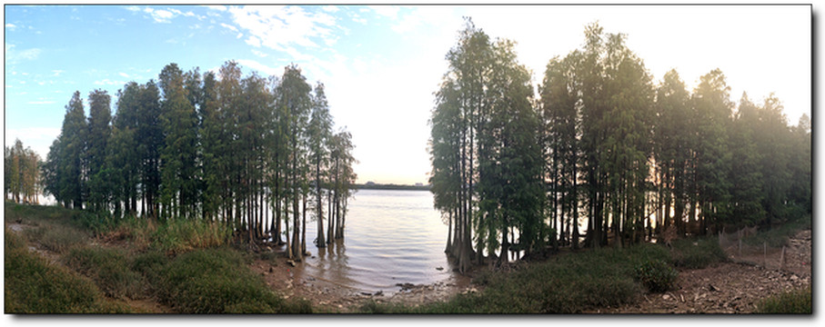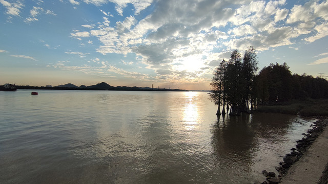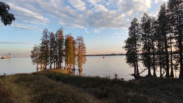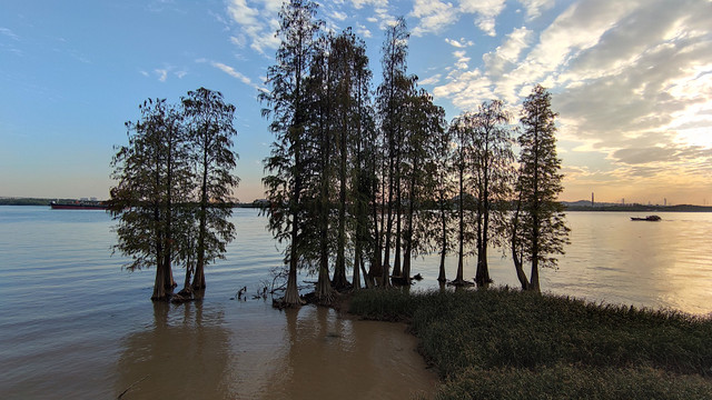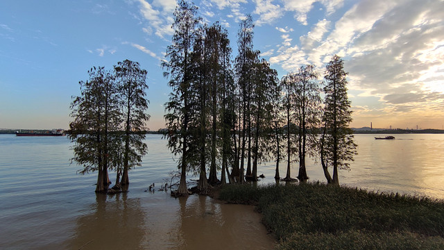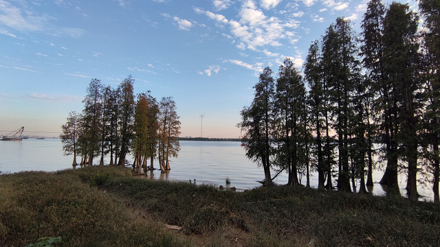 再次来到南面江边,黄昏的霞光下,景色很美,那一片树林..................