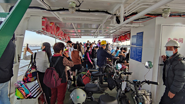 轮渡上有游客、有岛上的村民、也有上岛务工的,很容易区分,举着手机在拍照的基本上都是游客。