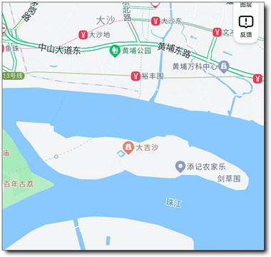 市区坐地铁13号线至裕丰围站A或B出口出站,经港前路、丰乐南路去乌涌水闸旁边的乌涌码头(见下图乌涌亭处),坐轮渡到大吉沙岛的生鱼洲码头登岛。