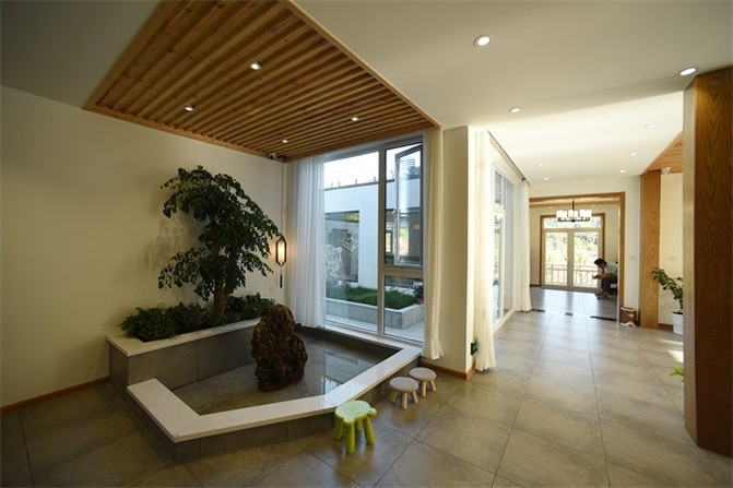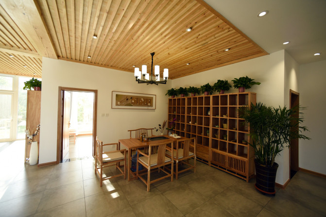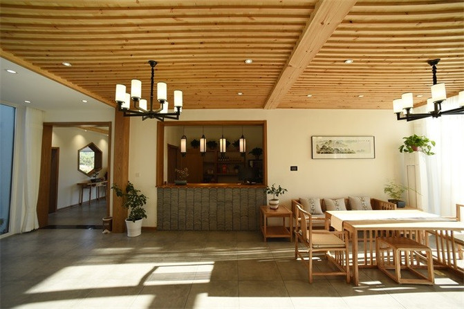 一楼大厅和走廊装饰都很有设计,空间非常大,这里还是一个休闲区,功能非常丰富,可以在这里点上酒水饮料,或者泡杯茶,这里使用木制家具,充满了田园气息,在灯光下氛围感十足。