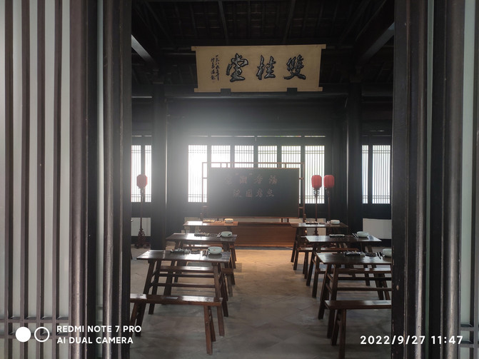 双桂堂是一处仿宋建筑庭院,庭院建筑,屋宇两楹,古雅幽静。天井内植有两棵桂树,一棵金桂,一棵银桂,故称“双桂堂”。