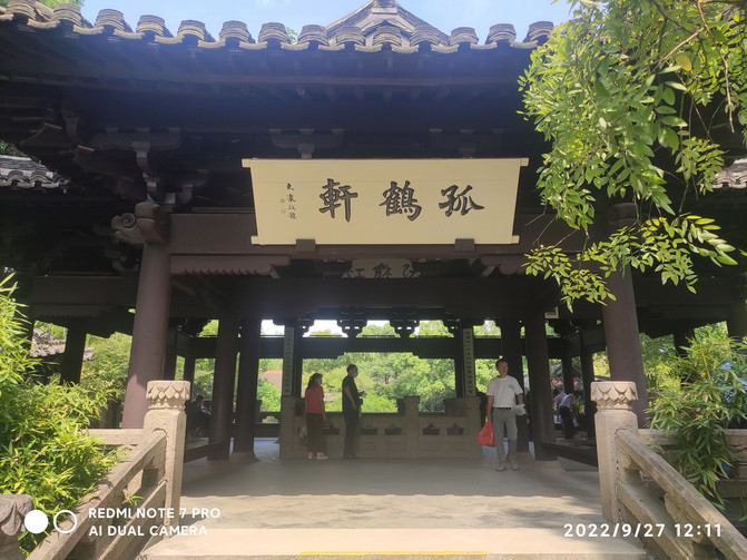 孤鹤轩位于沈园中部,是新辟建园林部分的景观中心。北临大荷花池宋池,与东北边滨水小榭逼遥相对,西边紧靠六朝井,南边是遗物壁和明池。轩为单檐歇山顶两面带廊的敞厅,平面为倒“凸”字形,宽而临水。构架为仿宋式木构,下为青石栏板围起的挑空平台,造型秀丽曲雅。孤鹤轩亦称“孤鹤哀鸣”处,是陆放翁的自喻。伟大爱国诗人陆游因南宋朝廷昏庸,壮志难以实现,发出孤鹤的哀鸣,以孤鹤自喻,隐喻诗人在人生中痛失伴侣,事业上报国无门、爱民有罪、屡遭贬职的坎坷一生。亭内有“亭池”遗址,1985年考古发掘时在此发现唐亭阁和明代的假山、鱼池遗址。“孤鹤轩”匾额分为内外两块,内匾额由著名书画家、文物鉴定家谢稚柳题写,亭外由大康敬书。