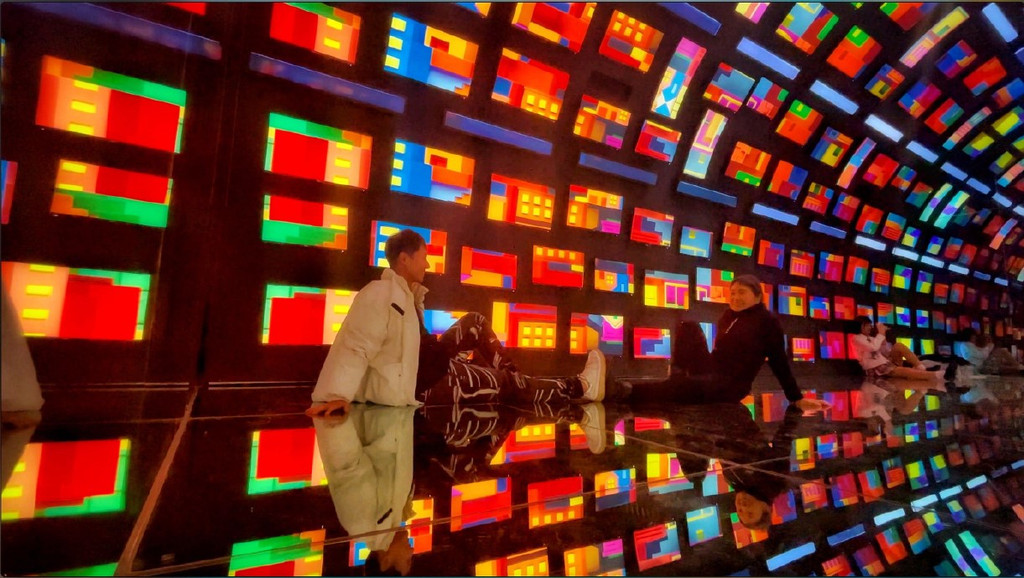 每一个角落都适合打卡,你可以在流量隧道里感受信息爆炸的眩晕;也可以在光之穿越和时光虫洞拥有炫酷的未来科技感;或是在镜无止境中体验迷幻的浪漫灵动,刚从VR沉浸式影院中梦醒,又一脚踏入海豚密码、梦想舞台,一步步走过,仿佛时光转换,斗转星移,从一个幻境掉入另一个幻境,就要迷路在这满是科技感的盗梦空间里了。