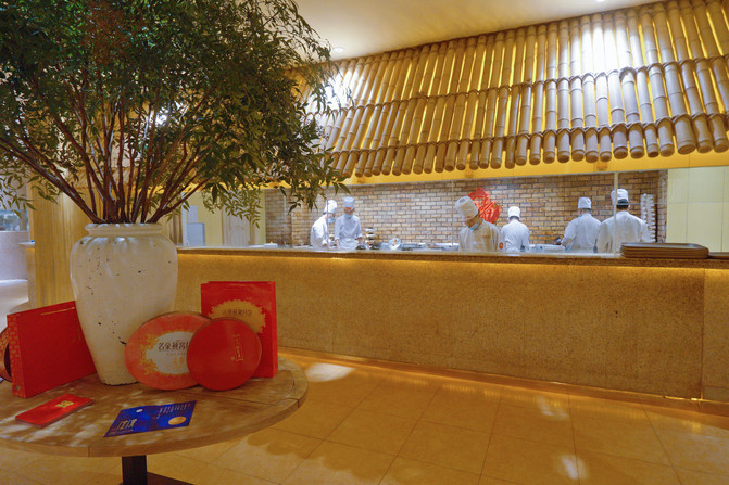 餐厅分布在酒店的三楼和四楼,直达电梯到餐厅4楼,整个四楼都是包房共22间。餐厅三楼是要从四楼内的自动扶梯下到三楼,属于禅茶一味的三楼,以外方内圆为设计的庭院式大堂(智欲圆而行欲方的本质,有多少人参透了......),竹帘、鱼池、木质松柏、景观石、木质筷架等都让人觉得舒适和诗意,追求悠闲、轻松随意的意境,甚至是五间分支房间内的五款不同摆设,都让人由衷得感受到惠食佳的多抹风情。