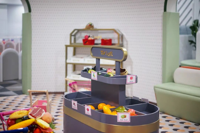 角色扮演区的物品精致而且种类比较多,小胖妞和弟弟都很喜欢这里,尤其是弟弟,对里面的小推车爱不释手,不停地推来推去!