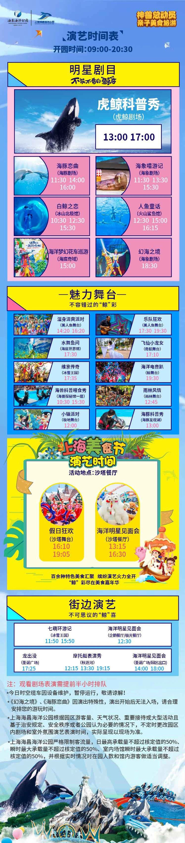 海兽探秘馆—海象剧场(有海象嘻游记的表演)—冰山北极馆—时空缆车—火山鲸鲨馆—《人鱼童话》—虎鲸剧场—《维京传奇》—《幻海之境》—南极企鹅馆—《海洋电音趴》