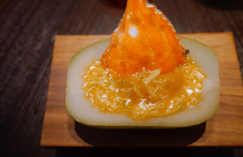 #东海野生膏蟹扒冬瓜#蟹肉细嫩与膏似凝脂熬成一丝丝后,放置在冬瓜内,养眼的摆盘,忍不住食指大动,来上一口,味道真是妙不可言,鲜而不咸,软中带劲。