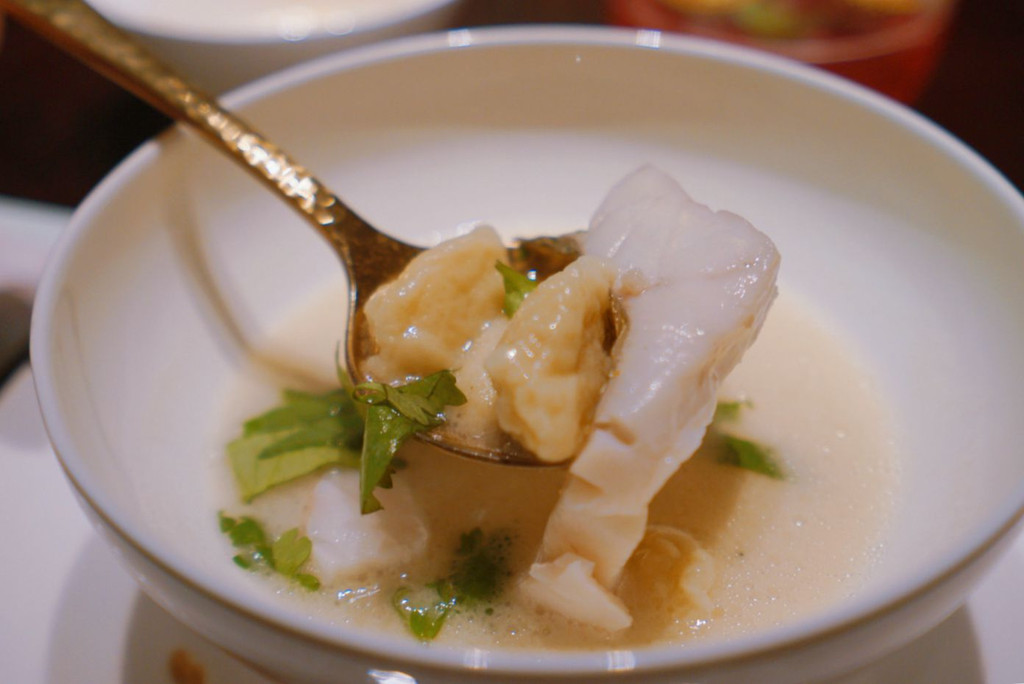 #堂做东海大黄鱼#由大厨亲临包房与食客面对面操作熬制大黄鱼汤,一碗热气腾腾鱼汤端到食客面前,清香四溢的鱼香味令人垂涎三尺,鱼汤色白如乳,鱼肉吃在口中细滑柔韧,肥而不腻,弥漫着诱人香气的黄鱼汤要乘热喝,才鲜香美味。