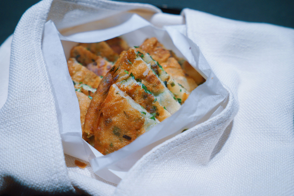 #葱油饼#用手拿了一小块葱油饼到嘴里,瞬间,葱油饼的鲜香味充分地与味蕾结合,一点一点的咀嚼,细细品尝,吃出虾肉与面粉融合得恰如其分,满嘴余香。