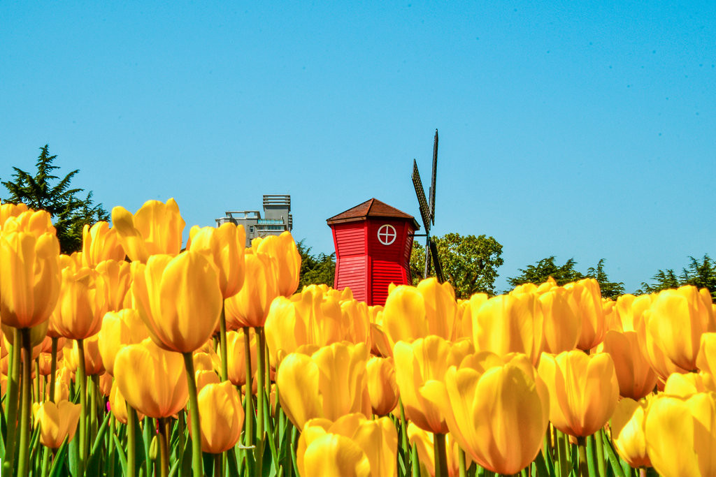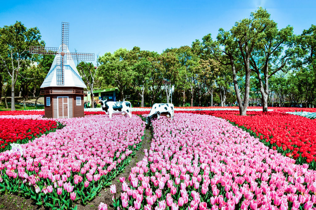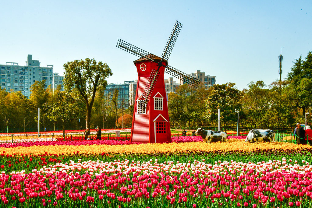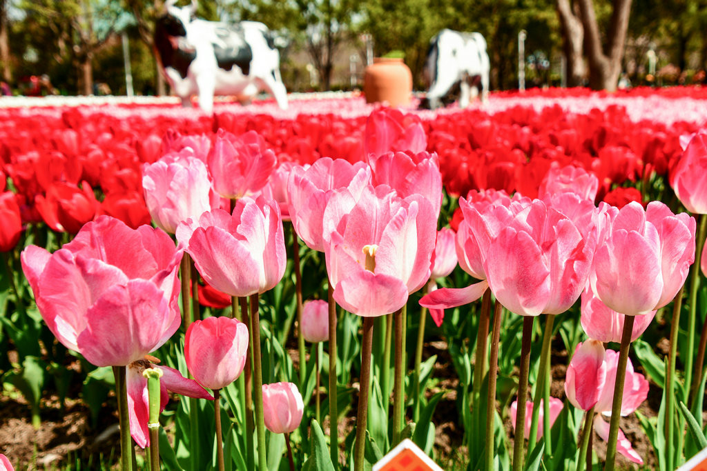 这里的郁金香品种很多,颜色很丰富,上百万朵郁金香盛开,成片的花海,蔚为壮观,还有荷兰费风车和奶牛,仿佛置身在荷兰。
