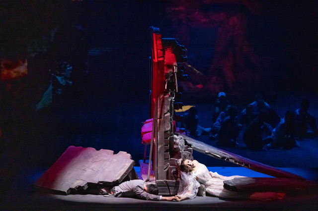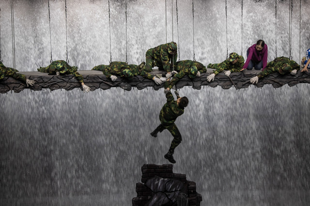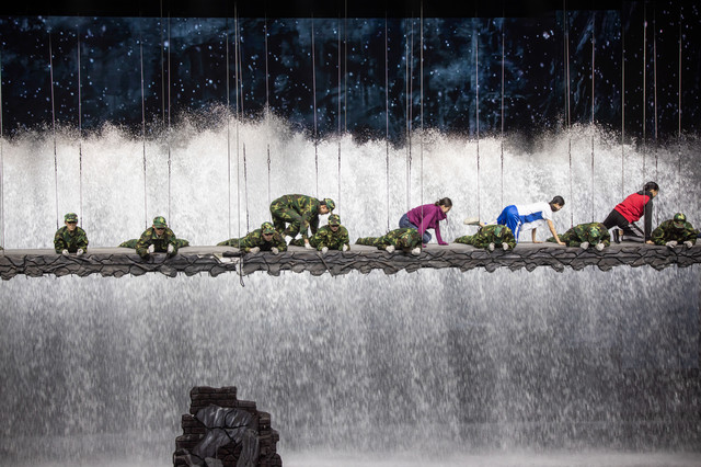 2舞台上居然有真正的洪水冲下,解放军手挽手搭成肉体长城让受灾群众通过洪水。
