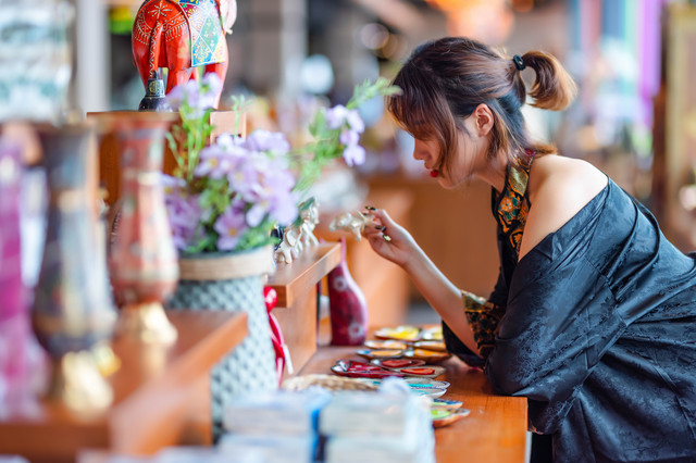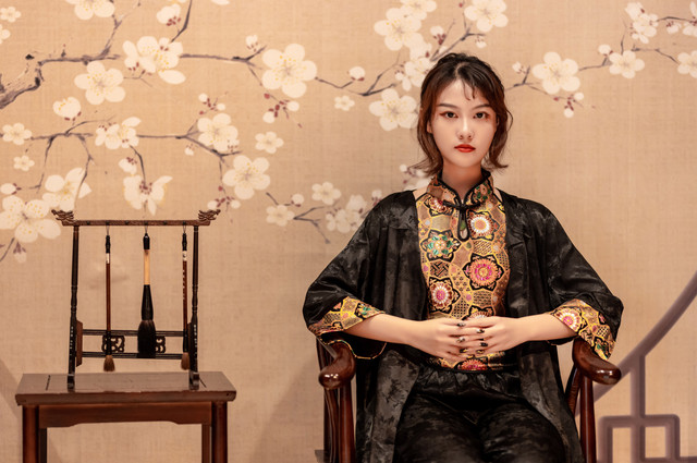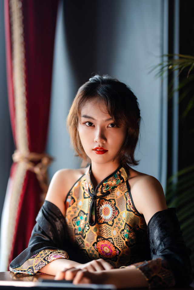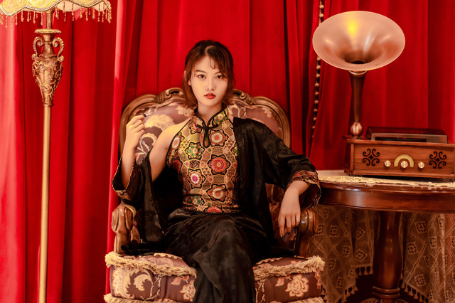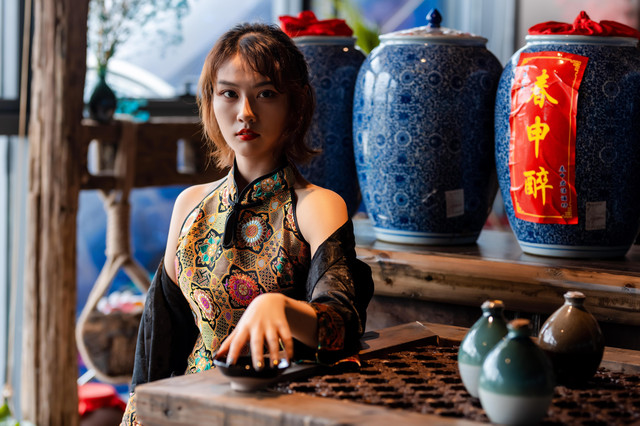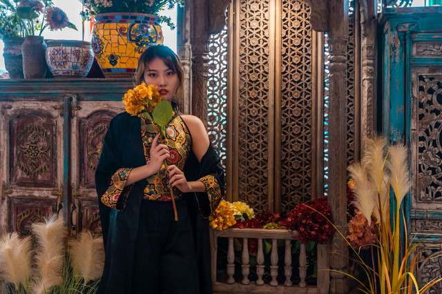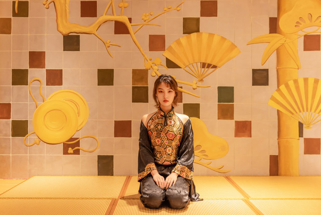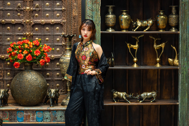 今天的小姐姐穿了一身很复古又不缺时尚的类似旗袍的服饰,和宋城场景非常搭,当然要寻找宋城内适合拍照的场景。