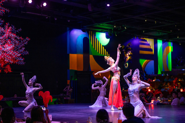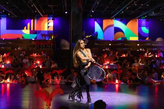 果然,桑巴秀开场就不会让人失望,战鼓敲响,演员们瞬间就把激情燃起来,值得一提的是桑巴秀全部的演员均为外籍。舞台设置在场地中央,无论坐在哪里都可以无死角观看演出!桑巴女郎甚至会到桌前和游客互动,热情奔放点燃了大家的情绪!