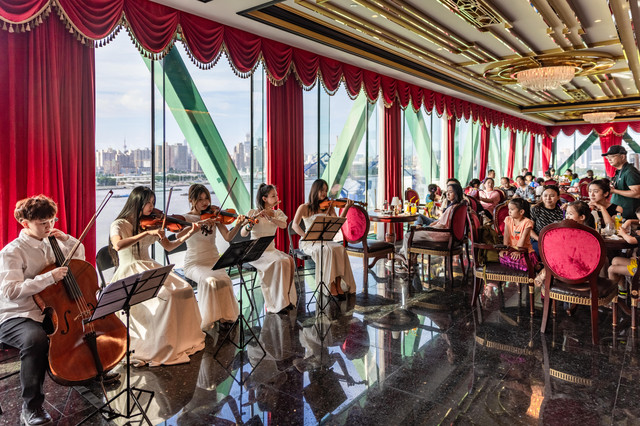 体验过热情桑巴,19点左右,刚好是日落时间!那就一定要到悬崖剧场了,一边欣赏悬崖音乐会,一边欣赏魔都夜景,灯光开启的一瞬间,夜上海就真正的被点燃了!一袭白衣的小姐姐们演奏激昂的乐曲,黄浦江上往返的货轮游轮。魔都的夜景不是盖的,夕阳点缀下,更是让人沉醉此,让人不得不感慨,这就是上海,这就是魔都!
