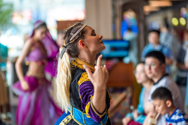 更养眼的是阿拉丁神灯里的各式人物突然出现在身边,并且载歌载舞,还会拉动身边的游客一起跳舞,这种沉浸式的互动体验在国内景区里是数一数二的!