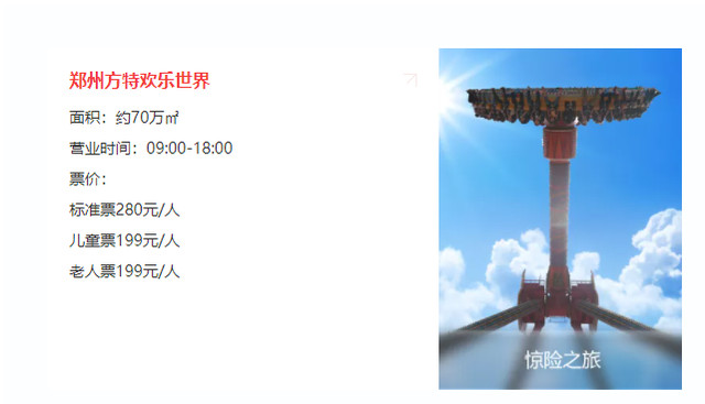 郑州方特欢乐世界包括许多先进的大型游乐项目,绝大多数项目老少皆宜。高空飞翔体验项目“飞越极限”;大型恐龙复活灾难体验项目“恐龙危机”;无压肩式圆环过山车“暴风眼”;巨型回旋式过山车“极地快车”;大型雪山探险项目“唐古拉雪山”;大型室内全彩LED魔幻剧场“飞翔之歌”都是必打卡项目。