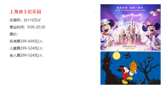 上海迪士尼乐园是一座王国风格的迪士尼主题乐园,包含七个主题园区,每个园区都有花园、舞台表演、游乐设施等项目,各个园区都有不同故事里的迪士尼形象。在沉浸式的主题乐园里,你可以身穿公主礼服游玩,也可以化身王子游览,晚上更有烟花秀给神奇的一天画上灿烂的句号。
