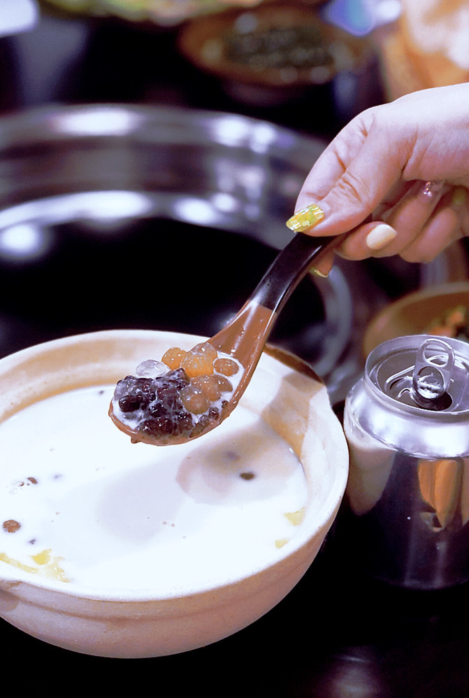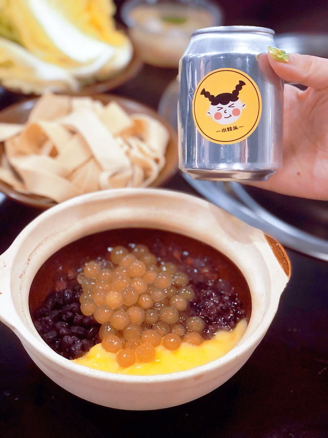 第一次喝砂锅做的#煲仔奶茶#料是真的多:珍珠、芒果布丁、红豆……好几样,整体口感正合适一点不齁甜。