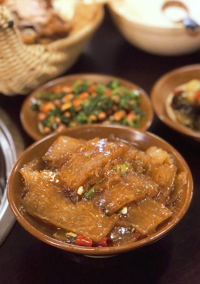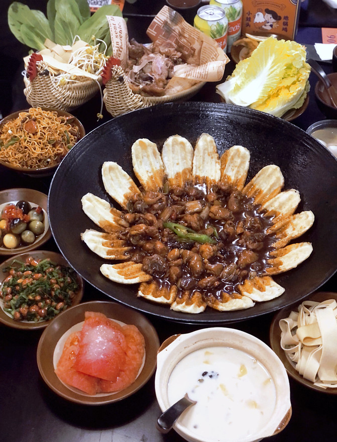 #满满鸡腿锅108元#一道民间美食,当服务员端上来掀开盖子,一锅苏北散养鸡其色光润红亮,其香浓郁,其味鲜醇滑嫩,贴在锅边的蘸满浓稠酱汁的灵魂薄饼太绝了,配菜里的粉丝是红薯粉、鸡胗,有嚼劲,鸡肉软烂入味,这一锅有荤有蔬有饼,越吃越上头。第一次吃到这么丰富的正宗皖北农家菜:脆口黄瓜、炒萝卜糕、符离集烧鸡、香菜花生米等等,挑花了眼,口味都很独特,快来尝鲜