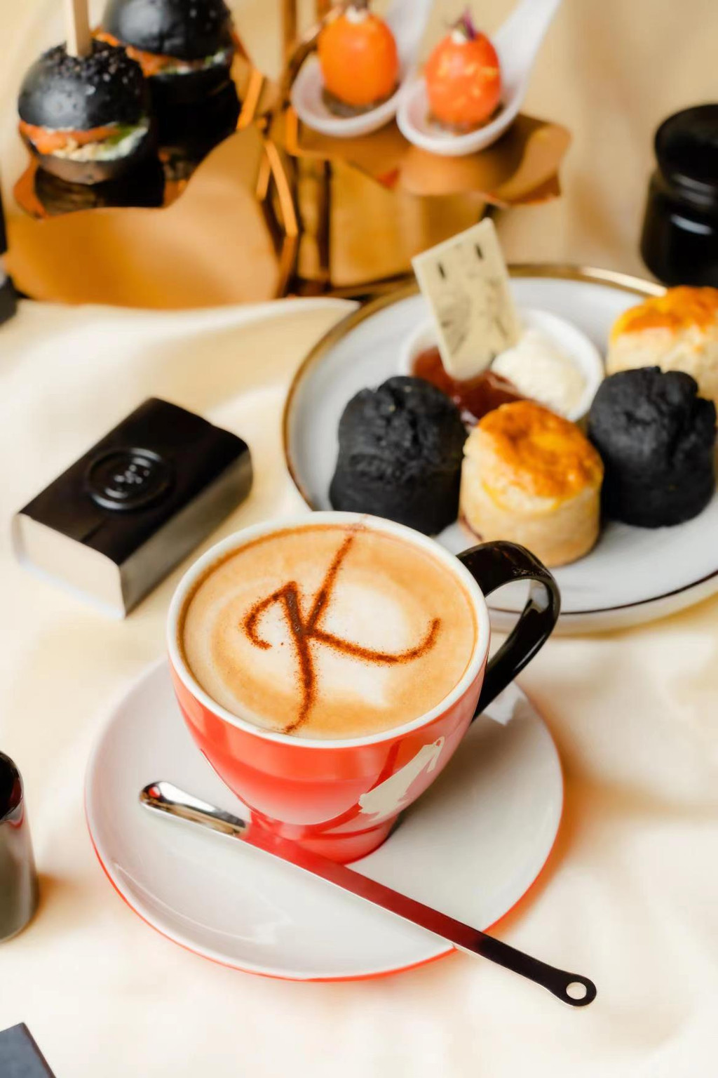 如令人垂涎的黑金面包配烟熏三文鱼,高级黑色调的柠檬马卡龙,具有春日气息清新爽口的黄樱桃番茄配柠檬酱,富有神秘感的欧臻廷图腾巧克力塔罗以及手工新鲜烘焙英式斯康松饼等。配上一杯香浓醇郁的小红帽咖啡或是西式茶,尽享悠悠春色;亦或是浅尝一杯泡沫绵密的起泡酒,悠享微醺午后时光。