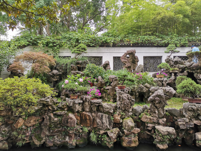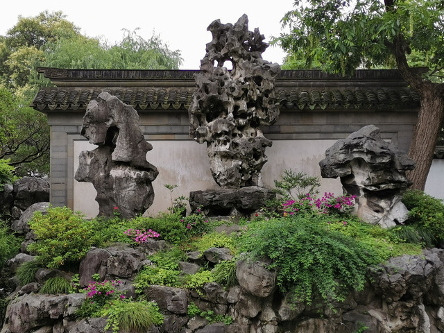 万花楼南面的湖石假山,奇峰林立。白墙花窗外栽植有一排翠竹,衬映成趣。一眼看去,俨然就是大自然中丛林丘壑的缩影。