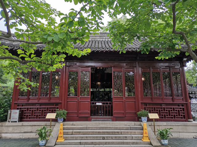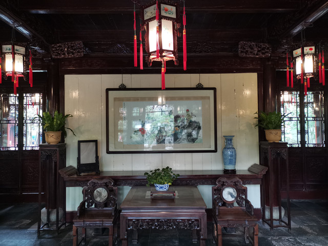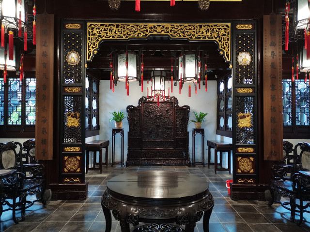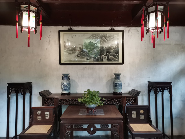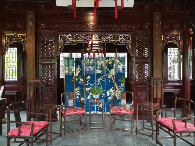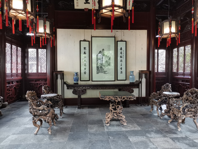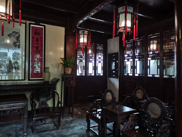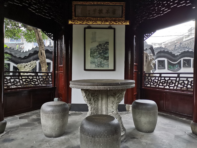 玉华堂。系园主人潘允端的书房,堂内陈列文房四宝、明代紫檀木画案等书房用品。