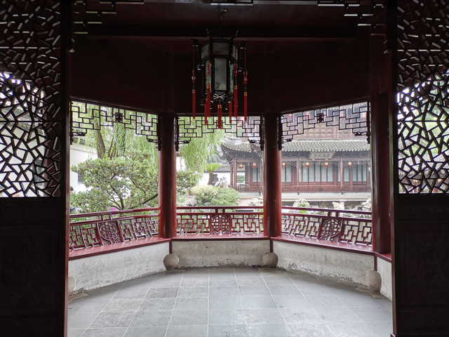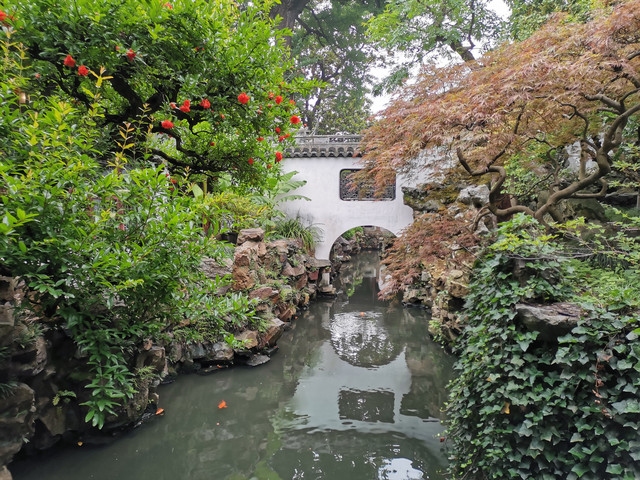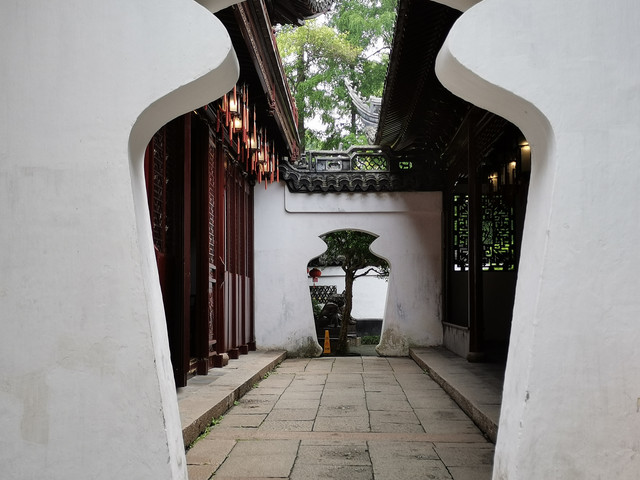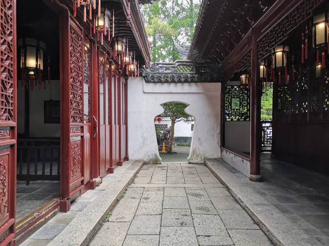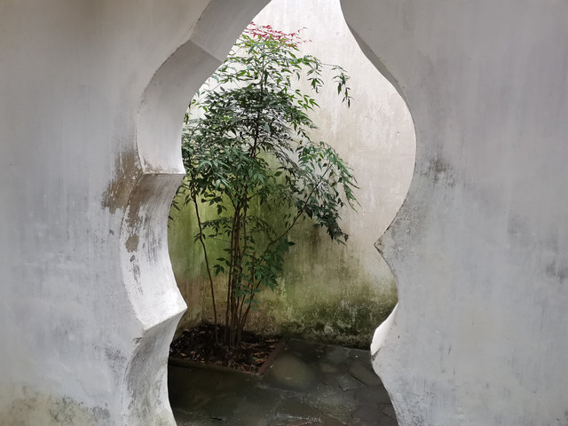 在玉华堂向北方向,经过一道圆形拱门,有一大片空间与视觉甚为开阔的山水园区。切不可忽略了路途中的风景,站在拱门处往北望去,背后园区内的池柳楼台,与拱门一起构成了一幅装裱精致的写意画。