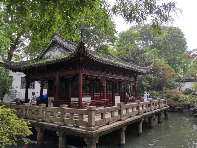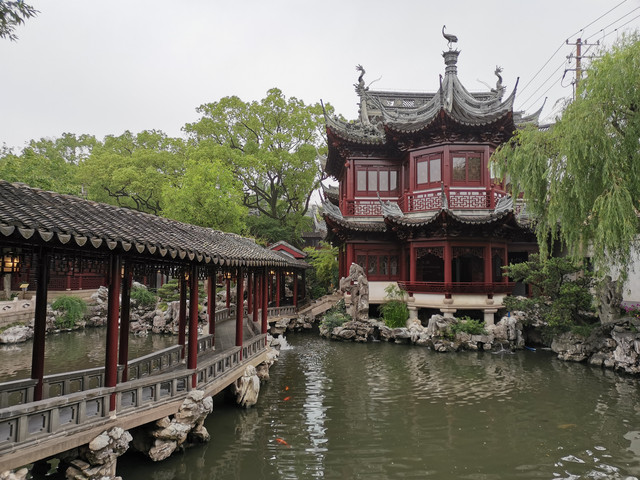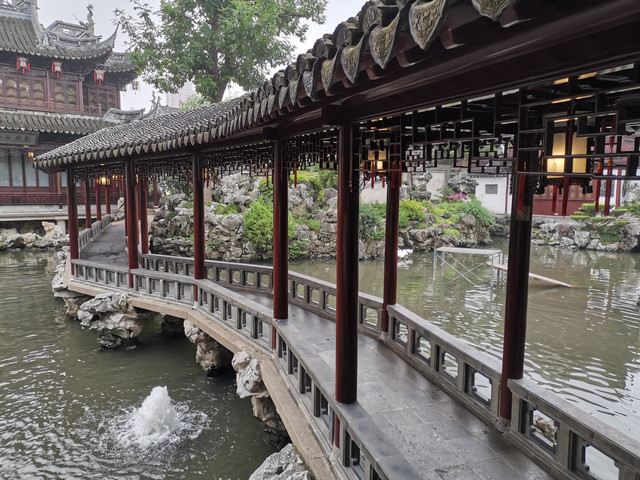 积玉水廊。一座连接水池两岸的廊桥,因廊旁有一石“积玉峰”而得名。水廊蜿蜒迂回,朱红木柱,很有质感,乃豫园一处经典景观,感觉有点像苏州拙政园里的小飞虹,虽然两者的长度相差很大。