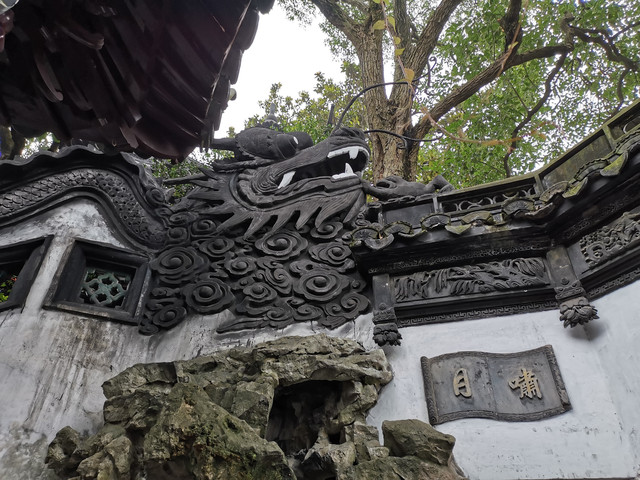 游豫园,大部分游客的顺序一定是自南门进,先从会景楼附近的空阔处开始,绕向北区的内园,然后折返向北,取道积玉水廊,最后由北门出园。我更喜欢逆向而行,北门入园,南门处结束,整体视觉感受上由近到远,由细至粗,倒也是一种不错的行走方式。