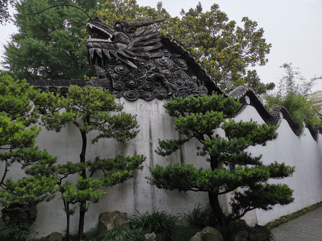穿云龙墙。泥塑龙头,瓦鳞龙身,位于点春堂西,北门进入即可见到。园区中还有另外几处龙墙:卧龙、双龙戏珠、眠龙,各有特色。