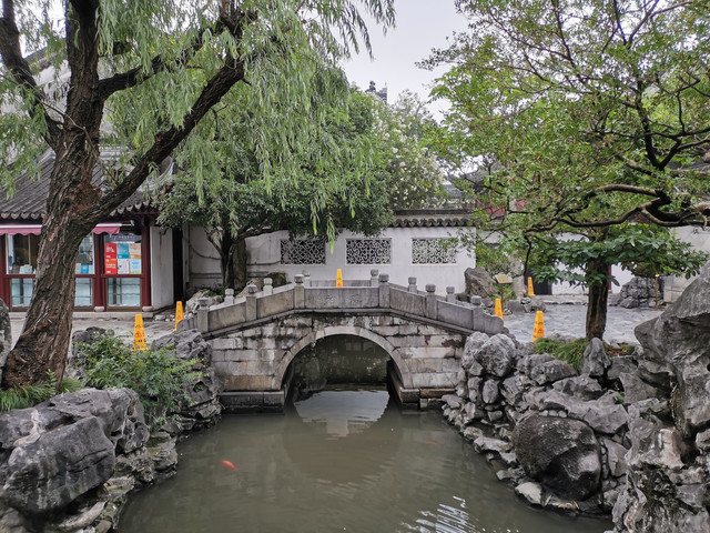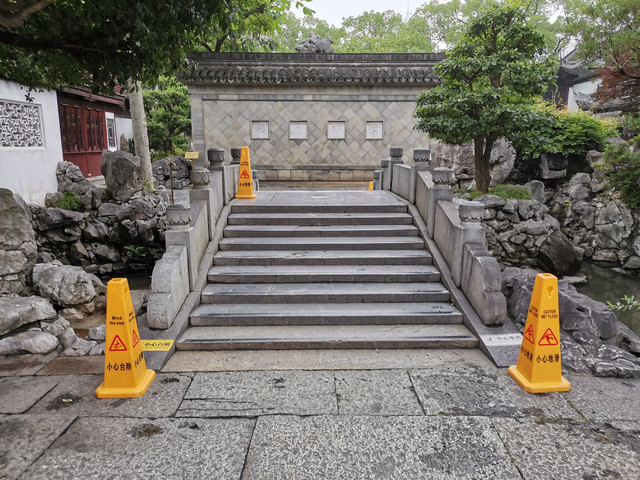 在园林构建艺术里,桥往往有着画龙点睛的作用,桥还肩负着连接所有零星小美成就一片大美的重任。在园林摄影发烧友眼里,桥也是构图取景营造视觉意境的关键因素之一。于是,见此美桥,我毫不犹豫地打开了我的破手机的后置四摄,然后才发现,心中所有园林空间美学里关于桥的诗文画意的幻想被摆放在桥头桥中桥尾橙黄艳丽的“小心台阶”的塑料警告桩一一击碎……